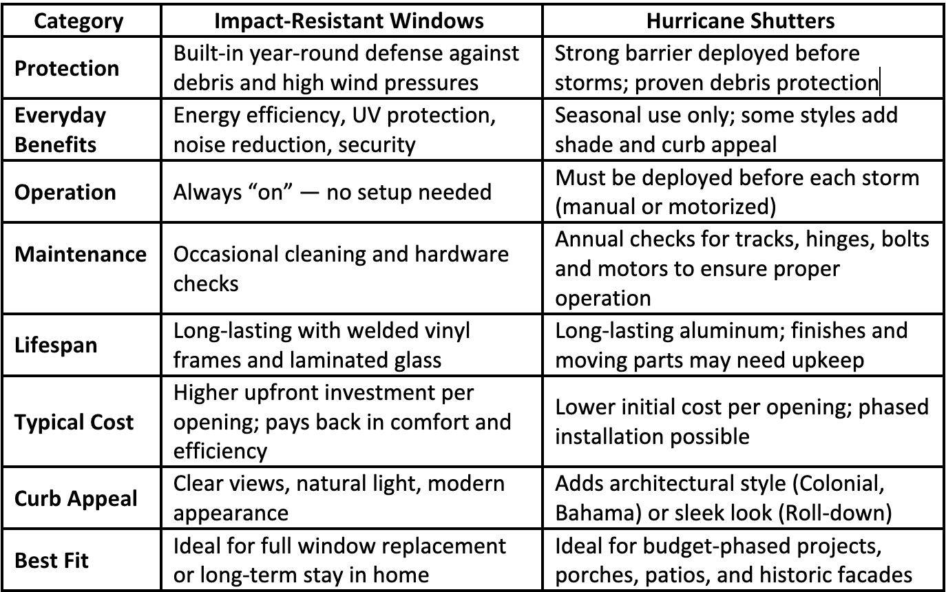 Over a decade, impact windows deliver day‑in, day‑out comfort, efficiency, and security without storm setup. Shutters deliver excellent storm performance and can be added where they do the best for less upfront money. Many homes mix both to balance budget and benefits.